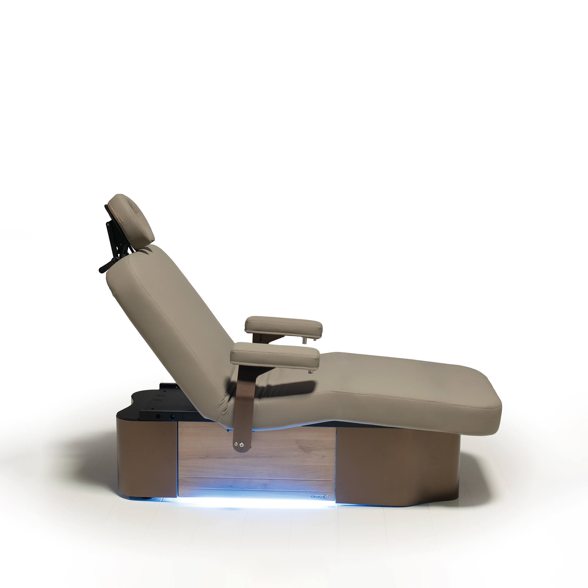 SpaFusion Comfort is the sophisticated base model of the SpaFusion treatment bed that offers high functionality and distinctive design without integrated foot tub or head spa components. It is ADA compliant and designed for versatility. It features an adjustable backrest and seat angle, a U-shaped face rest and optional heated upholstery - including the footrest - for unrivalled guest comfort. Customisable finishes ensure seamless integration into any spa décor, while the swivelling, removable armrests (optional) offer greater freedom for both guest and therapist. A streamlined essential for spas seeking form, function and style.